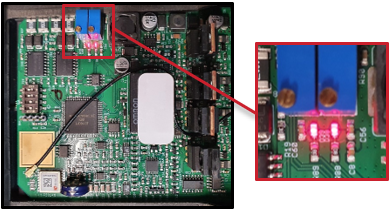 Inside the MAX-SAFE ECU housing, two LED lights are located adjacent to the two blue potentiometers. If these LEDs are flashing, the system has not obtained GPS LOCK.