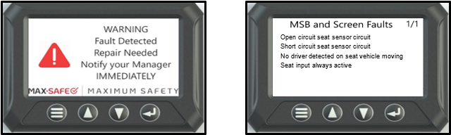 When the LCD screen ‘Fault Detected’ menu option displays a Seat Fault, and the MSB Fault Light remains constantly illuminated when the ignition is turned to ON (right),